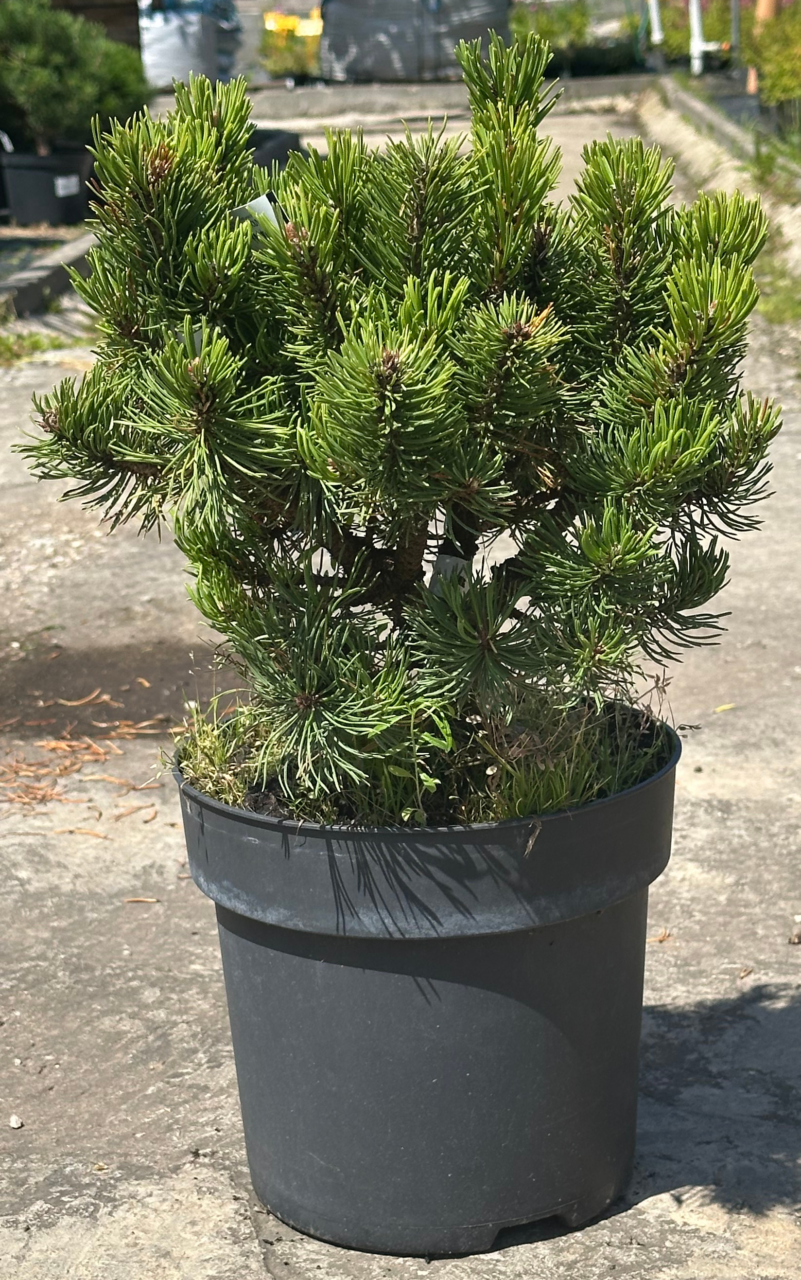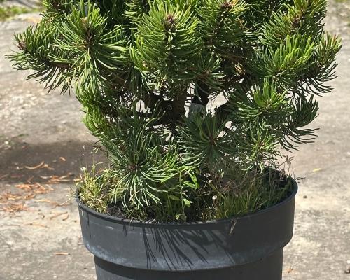 Невысокий кустарник с компактной кроной, которая разрастается медленно. Высота и диаметр растения могут достигать 0,8–1,2 м. Хвоя имеет тёмно-зелёный цвет, она короткая и жёсткая. Почки крупные и светлые, что придаёт кустарнику декоративный вид.