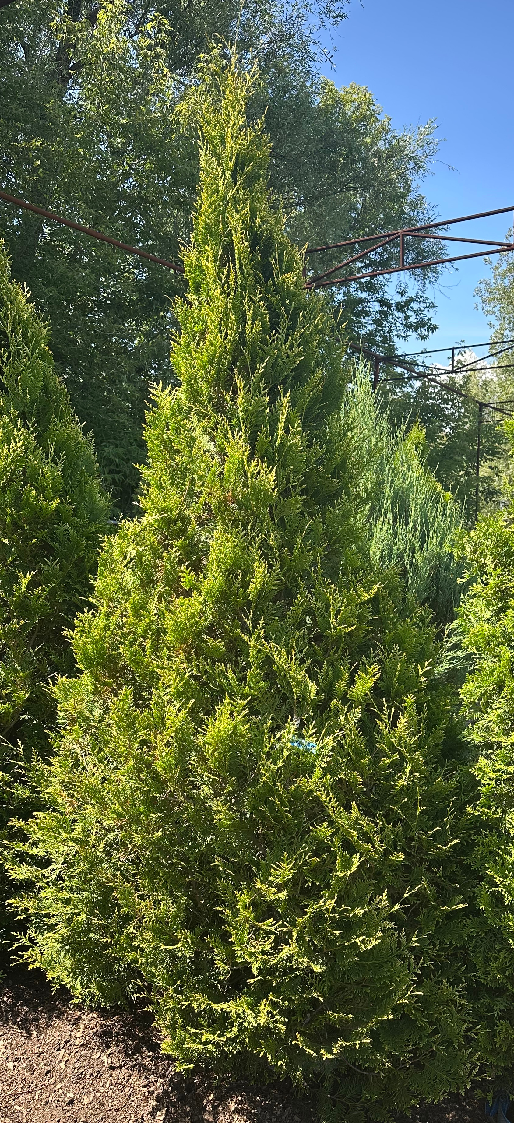 Кустарник с компактной кроной, которая имеет форму пирамиды или конуса. Высота растения в возрасте 10 лет составляет от 3 до 4 метров, а диаметр — от 0,8 до 1,2 метра. Кора молодых растений гладкая, красновато-бурая, но с возрастом становится серо-коричневой и начинает отслаиваться продольными лентами. Побеги кустарника растут вертикально, они короткие, но расположены густо. Толщина побегов средняя, они блестящие. Хвоя у растения чешуйчатая, плотно прижата к побегам. Она имеет ярко-зелёный цвет с контрастными золотисто-жёлтыми кончиками. Даже зимой хвоя сохраняет свой яркий цвет, но в сильные морозы может слегка буреть.