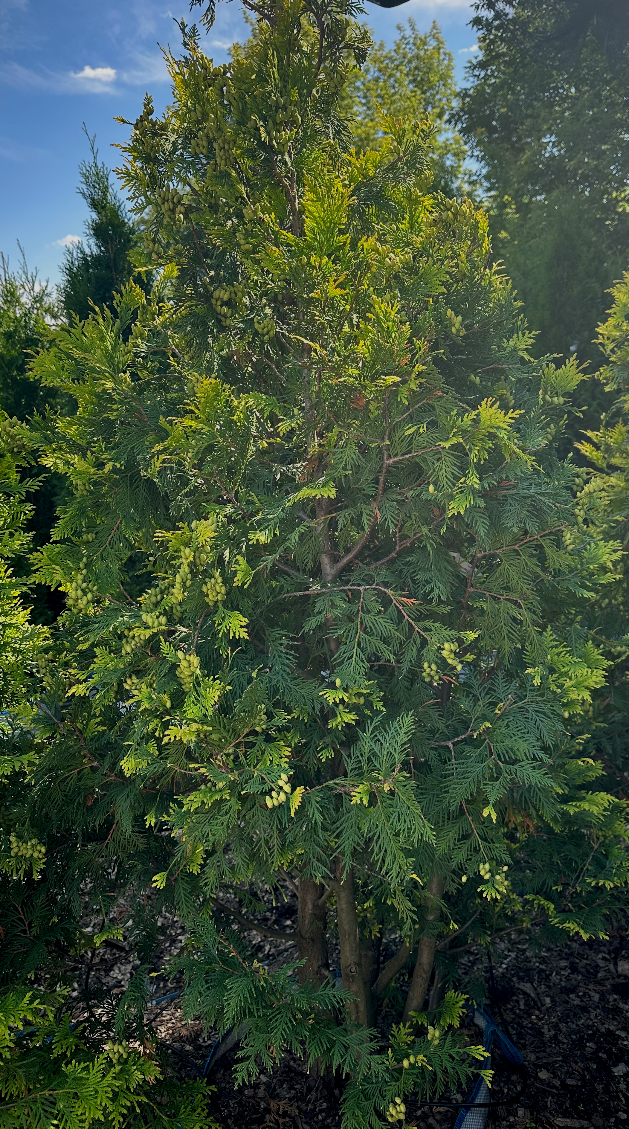 Это растение представляет собой кустарник или небольшое деревце, достигающее высоты до 4 метров и имеющее диаметр около 1-1,5 метров. Крона у него узкая, конической формы, а ветви растут вертикально вверх. Хвоя имеет форму чешуек, плотно прижата к побегам и расположена крестообразно вдоль них. Она яркая, золотисто-жёлтого цвета. Зимой её цвет становится оранжево-коричневато-жёлтым. Корневая система у этого растения поверхностная, но с несколькими основными глубокими корнями и множеством разветвлённых тонких боковых корней.