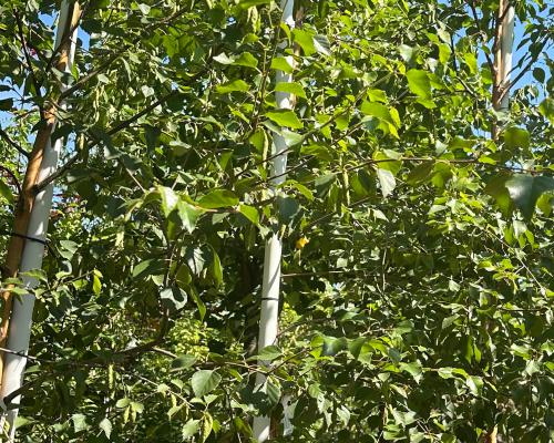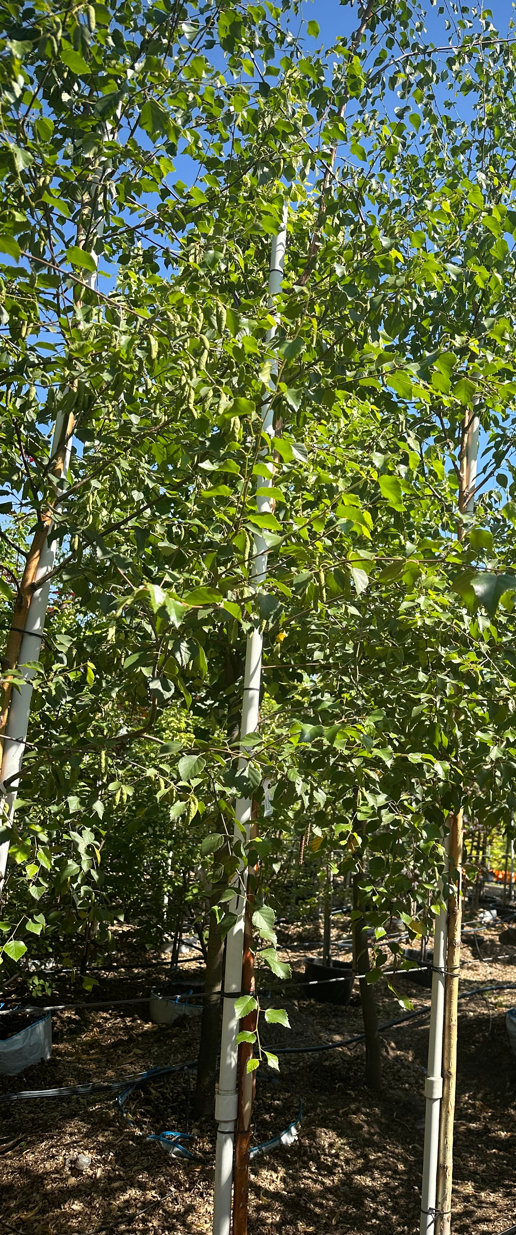 Дерево высотой от 10 до 15 метров, иногда до 20, с округлой или овальной кроной, которая достигает ширины 8 метров. Крона образована ветвями, которые направлены вверх или распростёрты, но не свисают. Молодые побеги покрыты пушком. Кора молодых ветвей гладкая, имеет красновато-бурый цвет, который со временем становится чисто-белым. На старых стволах кора сохраняет белизну окраски, темнея только у основания. Листья яйцевидной формы, заострённые, длиной до 6 сантиметров. Молодые листья клейкие и мягко опушённые, взрослые — голые и блестящие, тёмно-зелёного цвета, который осенью становится красивым жёлтым.