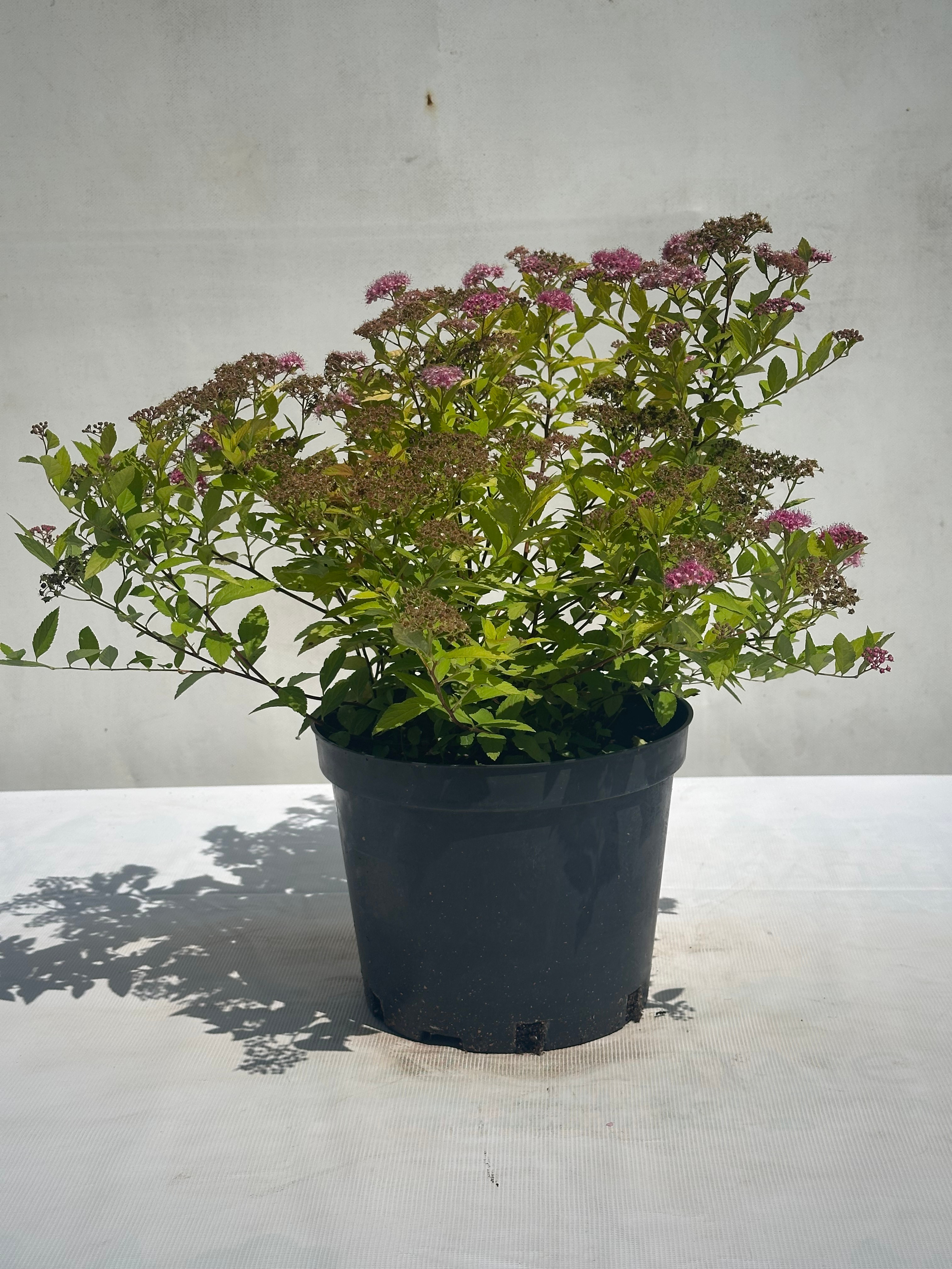 Кустарник с опадающими листьями, достигающий высоты 0,5–0,6 метра. Крона имеет округлую форму и компактный размер, её диаметр составляет до 0,8 метра. Листья кустарника простые, расположены поочерёдно, имеют яйцевидную форму с зубчатым краем. Весной они окрашены в красновато-оранжевый цвет, затем становятся ярко-жёлтыми, но более мягкого оттенка. Летом листья приобретают светло-жёлтый цвет с холодным оттенком, а осенью становятся оранжево-жёлтыми. В июне-июле на кустарнике появляются многочисленные розовые щитковидные соцветия небольшого размера.