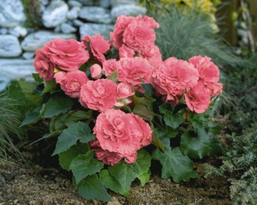 Бегония клубневая имеет яркие цветки разнообразной окраски и цветет до заморозков.