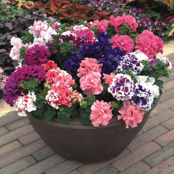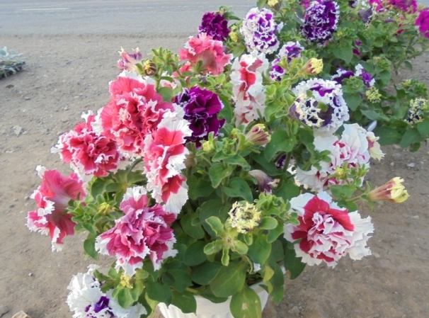 Цветки тёмно-розовые, белые, фиолетовые, красные, светло-розовые, двухцветные, создают пышное шоу на клумбах и балконах.