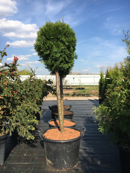 Туя западная Смарагд – декоративное хвойное растение из семейства кипарисовых. Крона имеет коническую форму. В высоту достигает пяти метров. Кора красноватого или серовато-коричневого цвета, которая отслаивается. Хвоя – зеленая, чешуйчатая, сохраняет окраску зимой. Цветет туя в апреле – мае. Это теневыносливая форма, которая нетребовательна к почве, переносит как сухость, так и избыточное увлажнение, морозоустойчивая. Применяется в разного вида посадках (одиночные, групповые, живая изгородь, контейнеры). Туя Смарагд на штамбе выращивается как формованное растение, поэтому нуждается в регулярной стрижке для поддержания формы шара.
