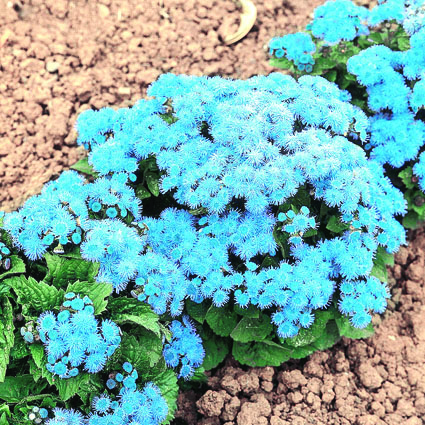 - Агератум. Род насчитывает 60 видов, произрастающих в Центральной Америке. Многолетние и однолетние растения. Кустики агератума раскидистые, иногда карликовые, до 60 см высотой. Листва расположена супротивно, городчатозубчатая. Цветки узко трубчатые, мелкие, собраны в соцветия — корзинки.