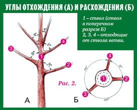 Обрезка молодых деревьев должна быть минимальной, не превышающей потребностей формирования кроны. При формировании кроны, как уже отмечалось, важно, чтобы скелетные ветви имели хорошее (крепкое) срастание со стволом, а это происходит, когда выбранная скелетная ветвь имеет угол отхождения равный 45 – 600. Углом отхождения называется угол, который образуется между стволом и отходящей от него ветвью, или между скелетной ветвью высшего порядка и ветвью низшего порядка (рис. 2). Достигая оптимального освещения при формировании кроны, выбирают углы расхождения скелетных ветвей равные 70 – 900 и более. Угол расхождения ветвей – это угол, который образуется двумя смежными ветвями, отходящими от ствола в горизонтальной плоскости (рис. 2).
