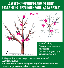 В Среднем Поволжье наиболее распространены естественноулучшенные кроны, при формировании которых значительно не нарушаются основные особенности естественного роста скелетных частей и общей формы кроны, а ослабляются или устраняются дефекты ее строения. В настоящее время популярна разреженноярусная крона с высотой штамба 60 – 70 см (рис. 3). Она применяется для яблони на полукарликовых и сильнорослых подвоях, а также для груши, вишни, сливы, черешни, абрикоса. Характеризуется сочетанием ярусного и одиночного размещения пяти – шести скелетных ветвей первого порядка ветвления и различных вариантов их расположения на центральном проводнике: нижний ярус из двух ветвей, а три верхние – одиночные; нижний ярус из трех ветвей, второй из двух скелетных ветвей, две верхние – одиночные и т.д. Оптимальный световой режим обеспечивается соблюдением (подбором) правильных углов расхождения скелетных ветвей и размещением их на центральном проводнике (по высоте) через определенное расстояние. Между ярусами должно быть 60 – 90 см, интервалы между одиночными ветвями равны 50 – 80 см. Ветви второго порядка закладывают только на трех нижних ветвях. Завершают формирование кроны удалением верхней части центрального проводника, переводом на одиночную боковую ветвь с углом наклона не менее 450. Высоту дерева ограничивают (удерживают) на уровне 3,5 – 4 метра для деревьев на сильнорослом подвое, и 2,5 – 3,5 метра для полукарликов.