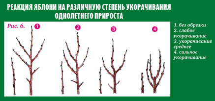 Рассмотрим этапы формирования разреженно – ярусной кроны на примере яблони. Основная задача послепосадочной обрезки состоит в отборе скелетных ветвей первого яруса (рис. 4). Максимальное количество ветвей в первом ярусе, как мы знаем, равно трем. Идеальный вариант: каждая ветвь имеет угол отхождения 600 и углы расхождения их равны 1200. Расстояние между основаниями двух выбранных скелетных ветвей по вертикали ствола равно 5 – 10 см, а третью располагаем на расстоянии 15– 30 см. Ветви, выбранные в качестве скелетных, уравниваем по силе развития (роста) и соподчиняем центральному проводнику (рис. 4). Для этого среднюю по положению (по вертикали ствола) ветвь укорачиваем на 1/4 – 1/3, а остальные обрезаем на этом (полученном после укорачивания средней ветви) уровне. При необходимости изменяем угол отхождения выбранным скелетным ветвям: слабым, недостаточно приподнимающимся ветвям, отставшим в росте, но нужным для формирования кроны, подвязкой к стволу придаем, более вертикальное положение, а чрезмерно сильным с маленьким углом отхождения, наоборот, наклонное положение – установкой распорок или подвязывая к штамбу (рис. 4).