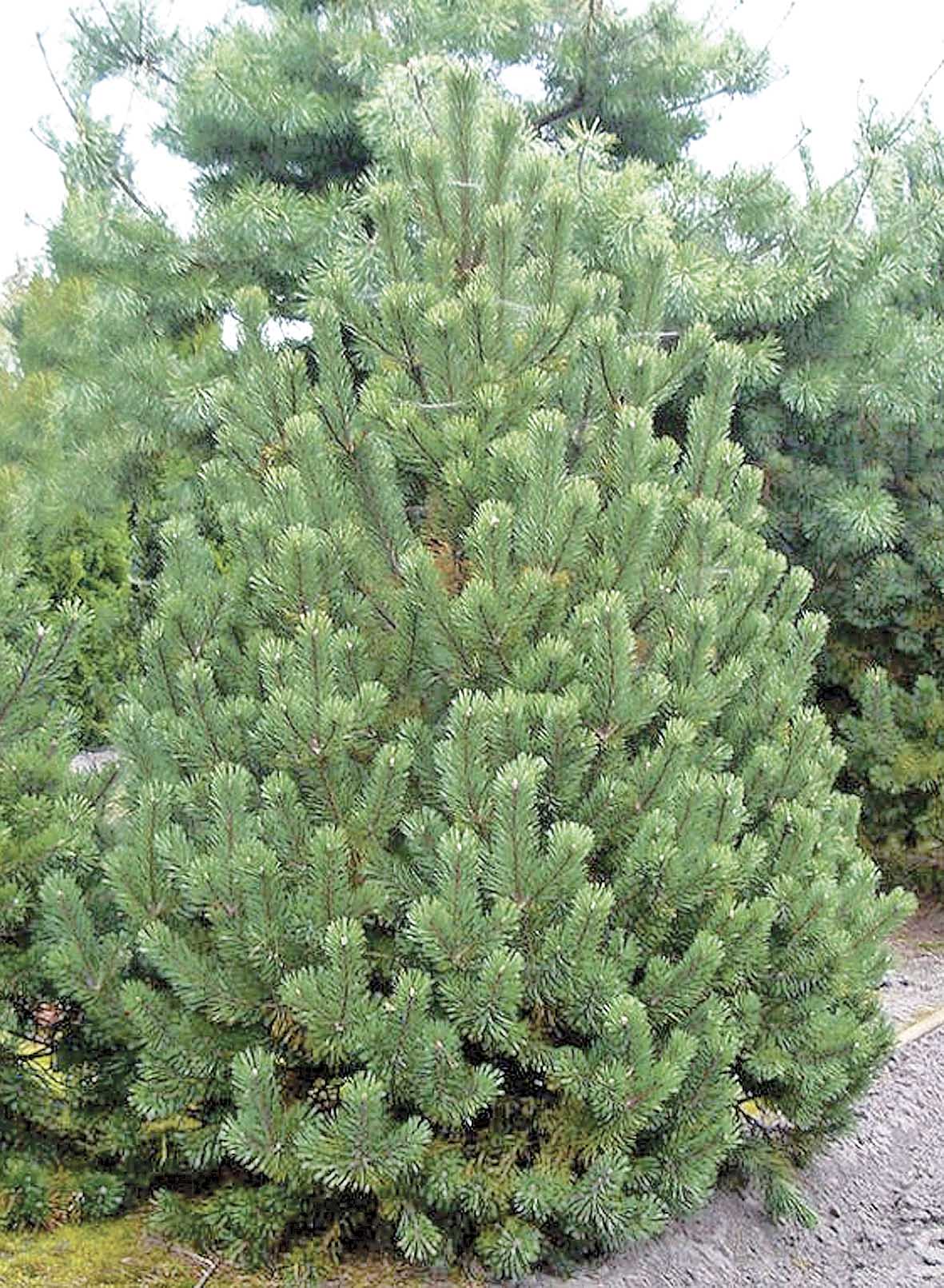 Это узкопирамидальное дерево средней высоты, внешне похожее на сосну веймутову. Годовой прирост – 25 – 30 см в высоту и 15 см в ширину. В молодости растет быстро. Крона густая, низкоопущенная до земли, кеглевидная. Хвоя трехгранная, прямая, длиной 5 – 12 см, ярко-зеленого цвета, жесткая, плотная, заостренная на концах. Иголки собраны в пучки по 5 штук. Сохраняется на ветвях три года. Используется в лесопосадках, парках, садах. Эффектно смотрится с цветущими или яркоплодными кустарниками. Лучшие соседи – барбарис, кизильник, чубушник, спирея, ракитник, а также лиственные деревья.