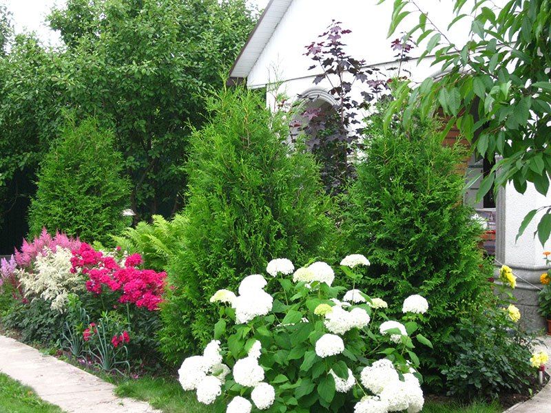 Далее эстафету подхватят гортензии крупноцветковые и крупнолистные, которые будут радовать вас шапками цветов (от белых до темнофиолетовых) около двух месяцев. Со второй половины до осени цветет гортензия метельчатая, меняя окрас от белокремовых и зеленых до багровых тонов. Такое сочетание растений очень распространено в европейских садах.
