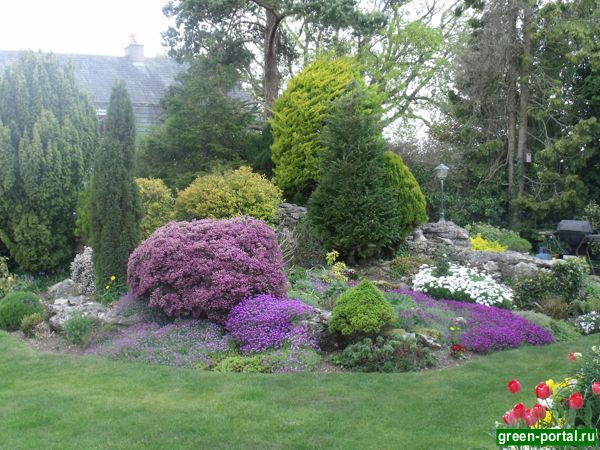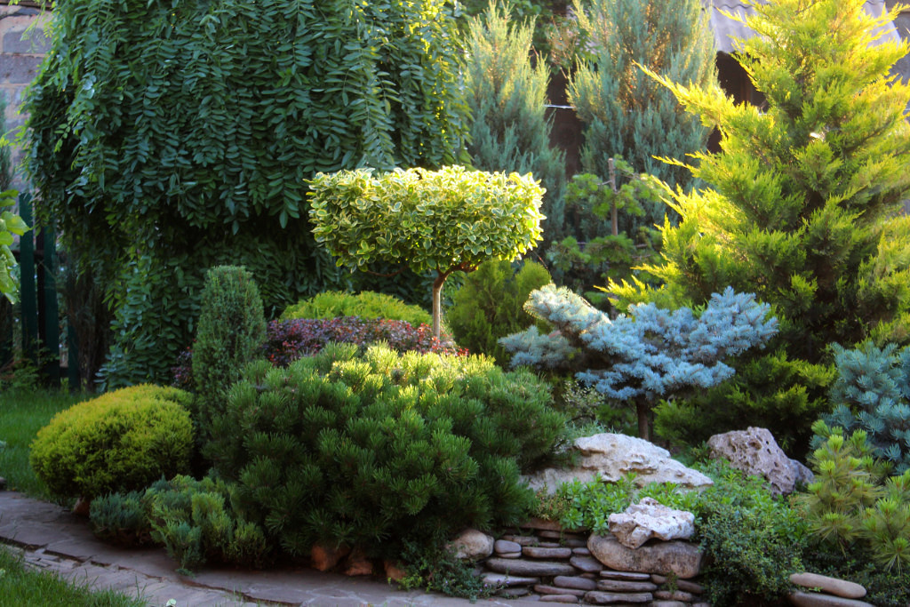 Клиенты ставят перед ландшафтными дизайнерами еще одну задачу: разместить хвойники при наличии уже благополучно растущих больших деревьев. В этом случае выручают низкорослые виды горных, веймутовых сосен «Радиата» и «Макопин», елей обыкновенных разных сортов. Сажают обычно такие растения в групповых посадках с цветущими кустарниками. Красиво сочетаются ели обыкновенные «Инверса», «Форманек» на штамбе, «Нидиформис», имеющий подушковидную форму, ель обыкновенная «Барри» яйцевидной формы, а так же ель сербская «Карел» с разными видами гортензий и рододендронами. Такая красивая композиция будет радовать вас круглый год. Хвойники – яркими приростами весной и замечательной зеленью круглый год, вечнозеленые рододендроны (требующие укрытия на зиму) – обильным ярким трехнедельным цветением.
