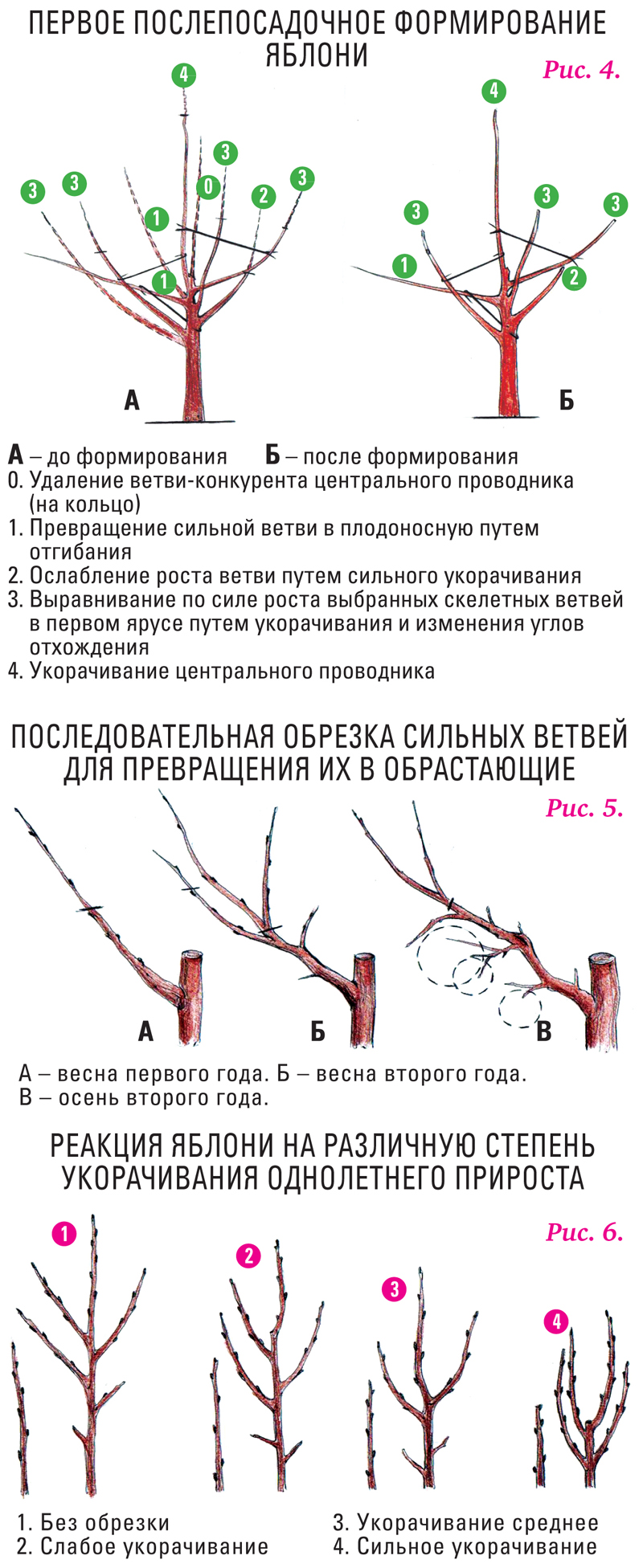 Рассмотрим этапы формирования разреженно – ярусной кроны на примере яблони. Основная задача послепосадочной обрезки состоит в отборе скелетных ветвей первого яруса (рис. 4). Максимальное количество ветвей в первом ярусе, как мы знаем, равно трем. Идеальный вариант: каждая ветвь имеет угол отхождения 600 и углы расхождения их равны 1200. Расстояние между основаниями двух выбранных скелетных ветвей по вертикали ствола равно 5 – 10 см, а третью располагаем на расстоянии 15 – 30 см. Ветви, выбранные в качестве скелетных, уравниваем по силе развития (роста) и соподчиняем центральному проводнику (рис. 4). Для этого среднюю по положению (по вертикали ствола) ветвь укорачиваем на 1/4 – 1/3, а остальные обрезаем на этом (полученном после укорачивания средней ветви) уровне. При необходимости изменяем угол отхождения выбранным скелетным ветвям: слабым, недостаточно приподнимающимся ветвям, отставшим в росте, но нужным для формирования кроны, подвязкой к стволу придаем, более вертикальное положение, а чрезмерно сильным с маленьким углом отхождения, наоборот, наклонное положение – установкой распорок или подвязывая к штамбу (рис. 4). Центральный проводник обрезаем так, чтобы он был выше уровня скелетных ветвей на 20 – 25 см. Остальные лишние сильные ветви ослабляем (укорачиваем на 5 – 6 почек) и тем самым переводим их в обрастающие (рис. 4). Этого же эффекта можно достичь, придав ветвям горизонтальное положение путем отгибания (рис. 4). Затем вырезаем ветви – конкуренты центрального проводника. Желательное направление росту ветвей придаем путем выбора соответствующих почек. У сортов со сжатой кроной укорачивание делаем на внешнюю, а с раскидистой кроной – на внутреннюю почку. На следующий год при формировании кроны подбираем очередные скелетные ветви на центральном проводнике с соответствующими интервалами, то есть через 50 – 80 см, соблюдая все требования к углам отхождения и наклона. Необходимо очередные скелетные ветви выбирать в промежутках между двумя нижними ветвями (рис.3). Затем соподчиняем скелетные ветви первого порядка центральному проводнику, а второго порядка – проводникам скелетных ветвей первого порядка. При этом проводники скелетных ветвей нижнего яруса и верхнего должны быть примерно на одном уровне. Вырезаем ветви – конкуренты центрального проводника, скелетных ветвей и другие сильные ветви с острыми углами отхождения и «волчки». Отбираем скелетные ветви второго порядка на скелетных ветвях первого порядка в первом ярусе. Для этого подходят ветви, растущие по бокам скелетной ветви первого порядка, с оптимальными углами отхождения, выбираем не более двух таких веток. Остальные сильные ветви подрезкой переводим в обрастающие (рис. 5). Если есть возможность, то укорачивание нужно заменять другими приемами (изменение угла наклона ветвей, деформация ветвей, кольцевание и др.) перевода ветвей в обрастающие (рис. 4, поз. 1). Основные (скелетные) ветви заложили, в последующем обрезка должна быть регулярной, так как проще удалить одно,двулетнюю ветвь, чем четырех, пятилетнюю. На протяжении формирования удаляем сильные ветви, растущие в центр кроны и вертикально, перекрещивающиеся и налегающие друг на друга. Удачно расположенные ветви переводим, применяя различные способы управления ростом ветвей, в обрастающие.