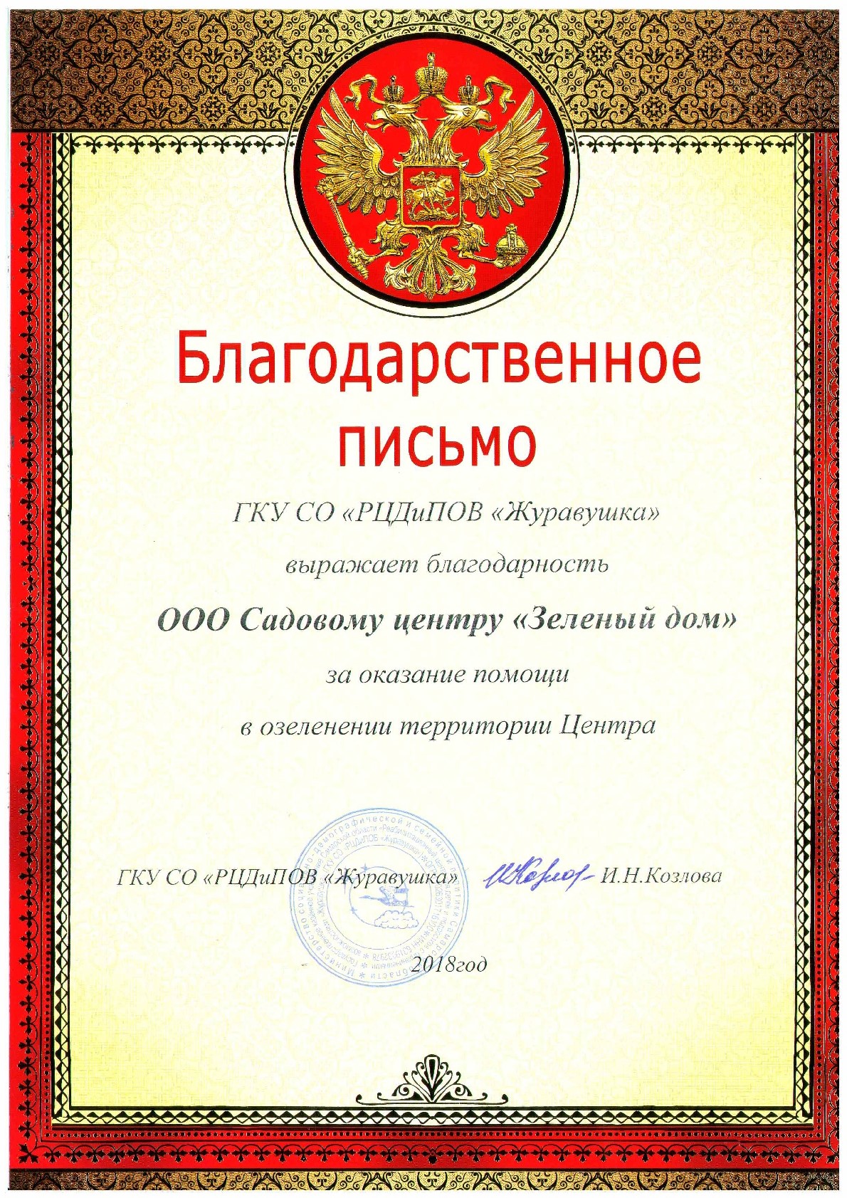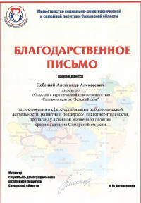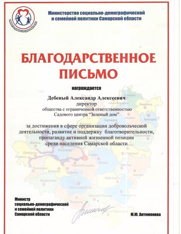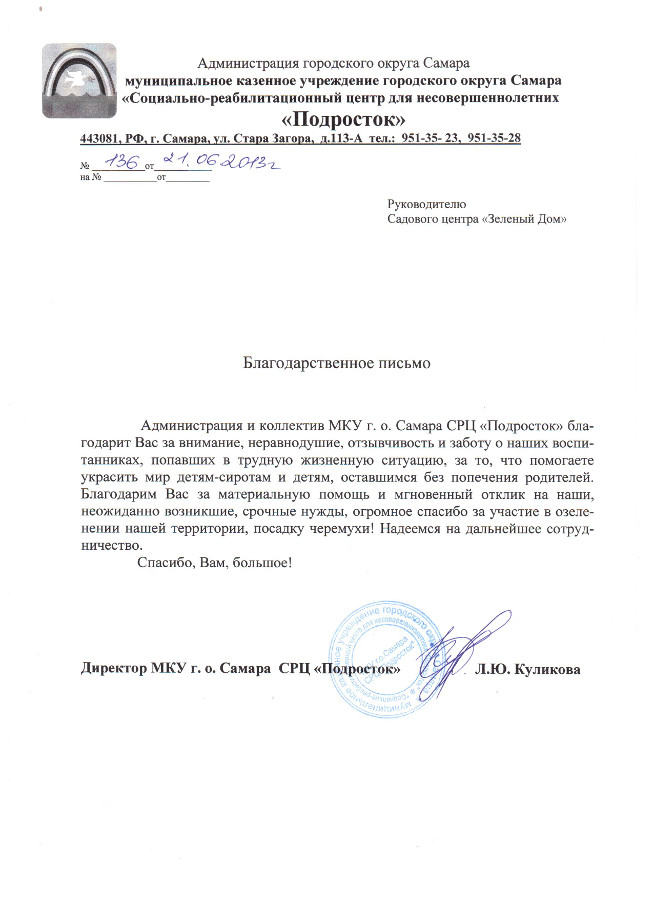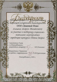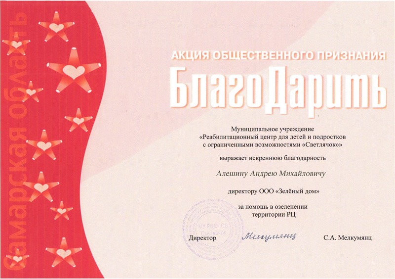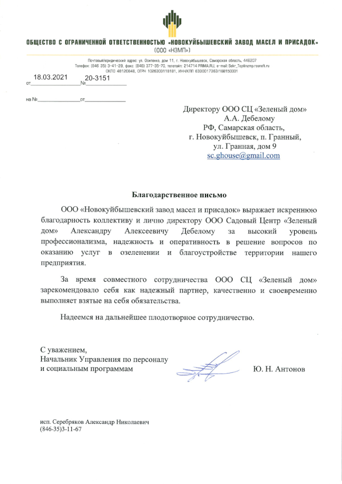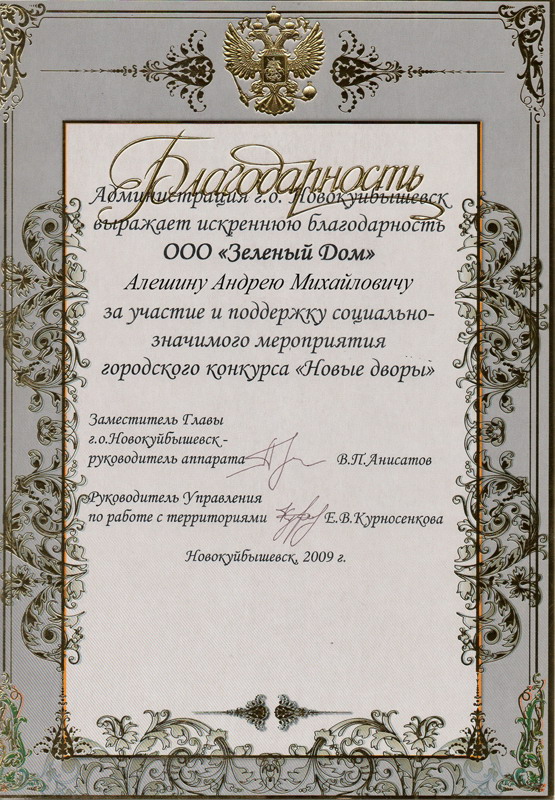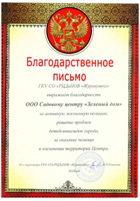 ООО РСК "Арсенал" благодарит коллектив ООО "СЦ зеленый дом" за профессионально оказанные услуги по проектированию и озеленению предприятия оказанные в 2010 году, а так же за качественное обслуживание 2011 года.