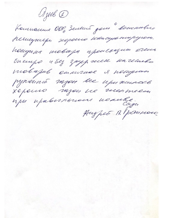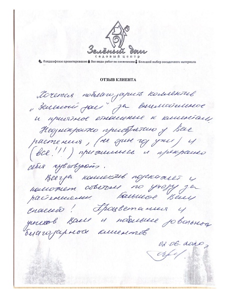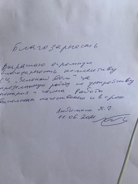 Выражаю огромную благодарность коллективу СЦ «Зеленый дом» за проделанную работу по устройству рекария и газона. Работы выполнены качественно и в срок.