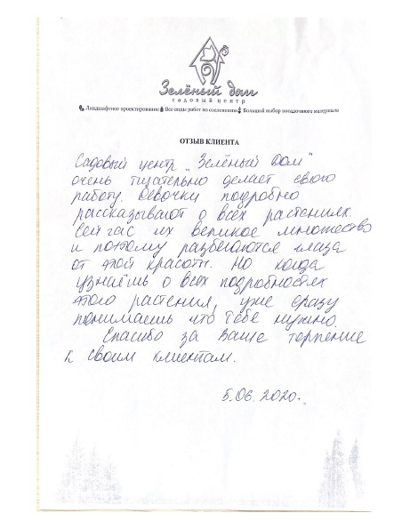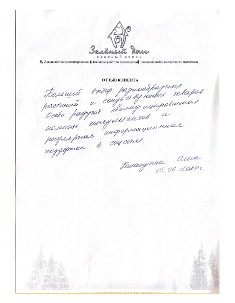 Выражаю благодарность всем сотрудникам Садового центра "Зеленый дом" за качественную работу по посеву газона. Все работы выполнялись в срок, быстро, очень тщательно обрабатывался газон. Общение с сотрудниками центра было приятным.