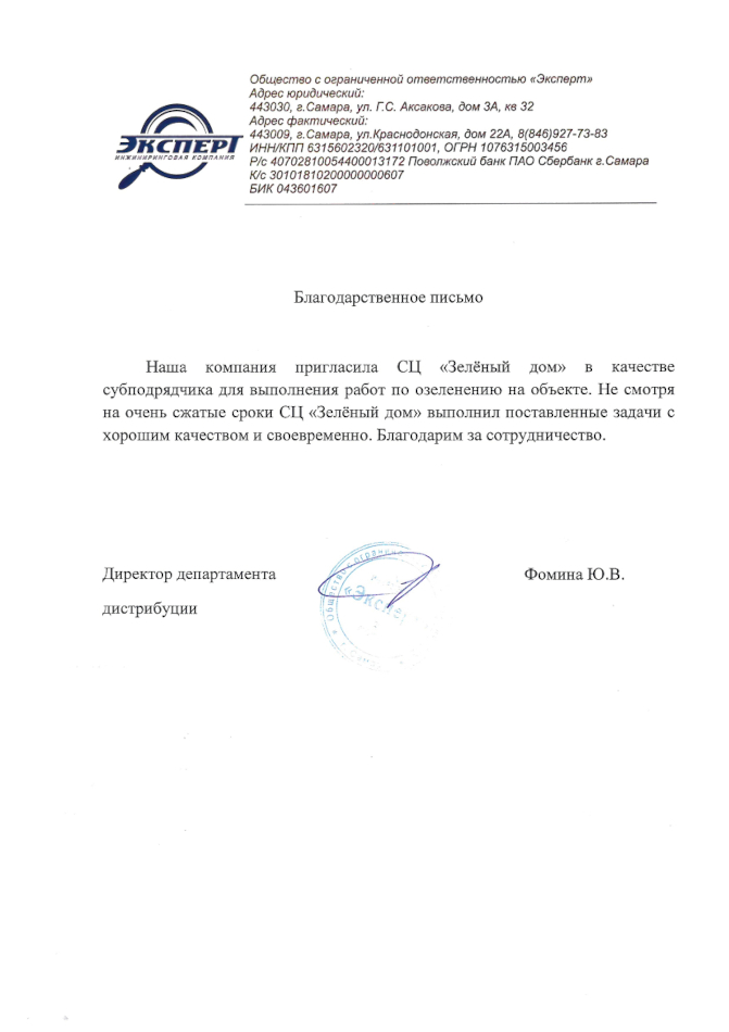 Коллектив Новокуйбышевского отделения Сбербанка РФ выражает искреннюю благодарность ООО "СЦ Зеленый дом", за качественно выполненные работы по озеленению и обслуживанию территории.