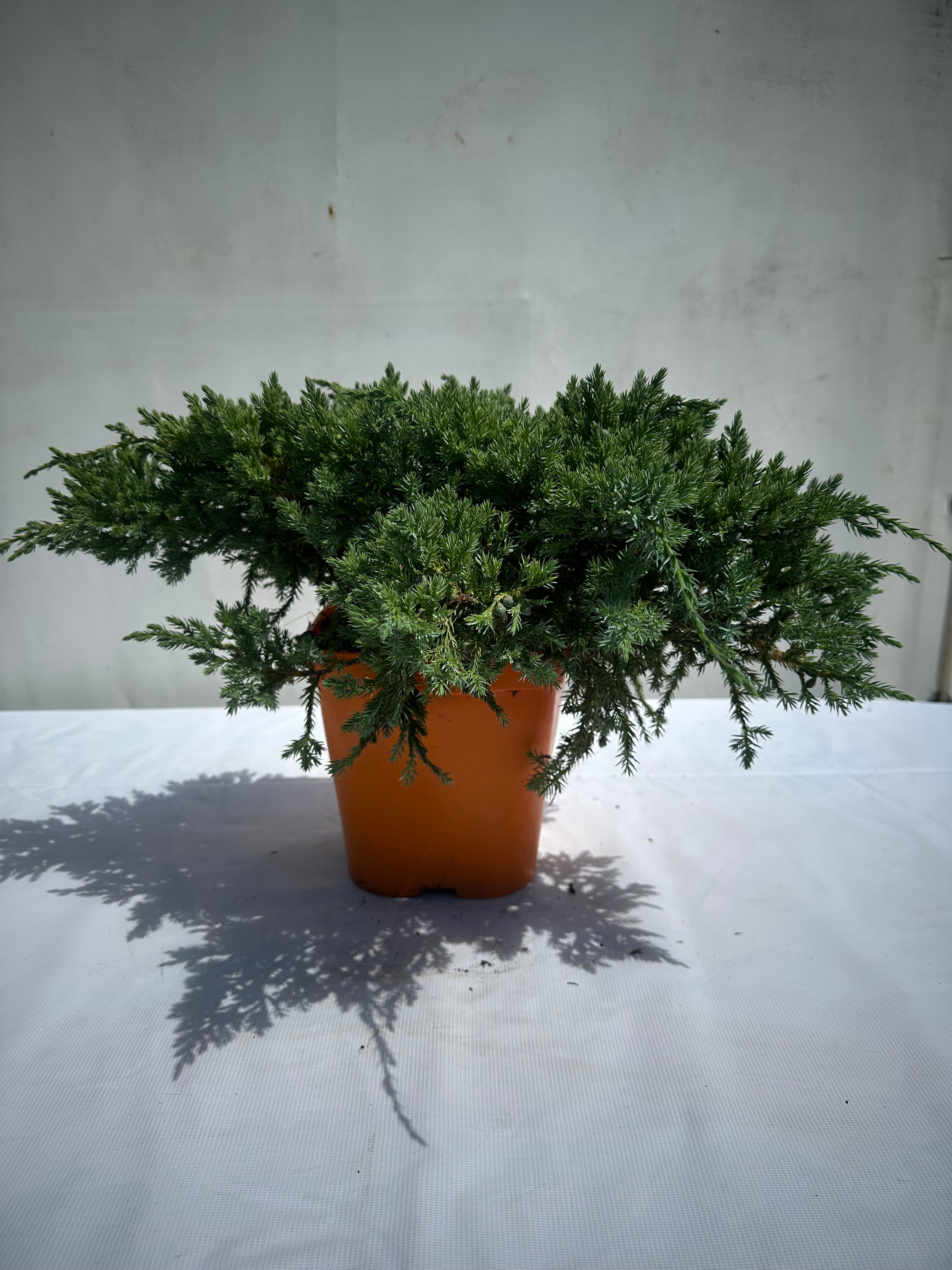 Кустарник, который быстро растёт, имеет широкую и плоскую крону, которая стелется по земле и сильно ветвится. Побеги на концах слегка опускаются вниз. К десятилетнему возрасту растение достигает в высоту от 30 до 60 сантиметров и в диаметре от 150 до 200 сантиметров. Это женская форма. Хвоя у растения острая, имеет форму иголок и серо-голубой цвет.