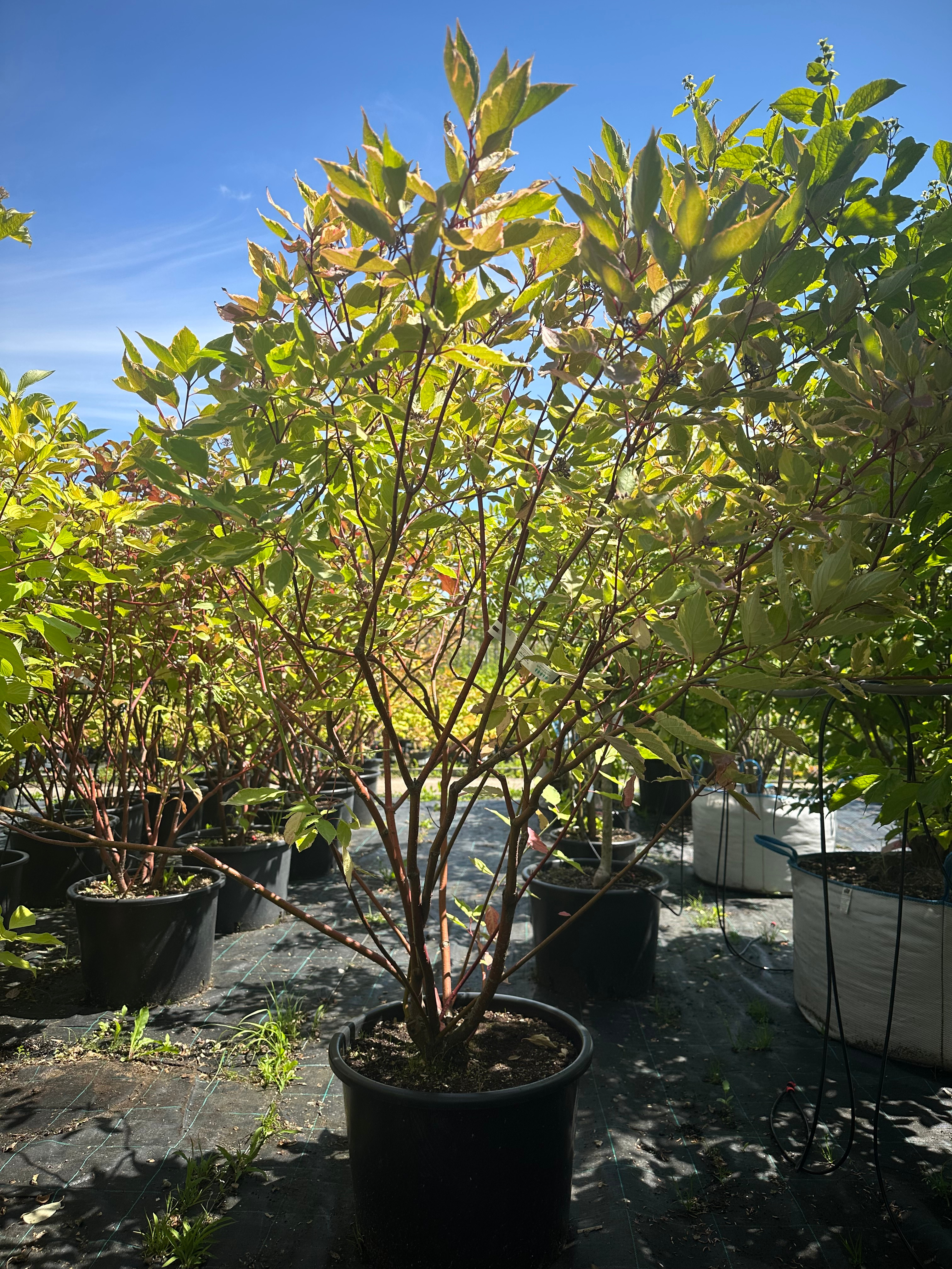 Кустарник, который сбрасывает листву, может вырастать до трёх метров в высоту и ширину. Его ветви растут вверх, а нижние ветви становятся раскидистыми. Побеги длинные и напоминают прутья. Они имеют тёмно-красный или пурпурно-фиолетовый цвет, что делает их очень эффектными в конце осени, зимой и начале весны. Листья кустарника овальной формы, тёмно-зелёные с красноватым оттенком. Снизу они сизовато-белые и немного морщинистые. На каждом листе можно увидеть шесть пар жилок. Длина листьев достигает 12 сантиметров. Осенью они окрашиваются в фиолетово-красный или коричневато-красный цвет. Кустарник цветёт мелкими бело-кремовыми цветками, которые собраны в выпуклые щитки диаметром до 5 сантиметров. Цветение происходит в первой половине лета. Плоды кустарника имеют шаровидную форму и напоминают ягоды. Сначала они белые, но затем приобретают голубоватый оттенок. Кустарник растёт быстро.