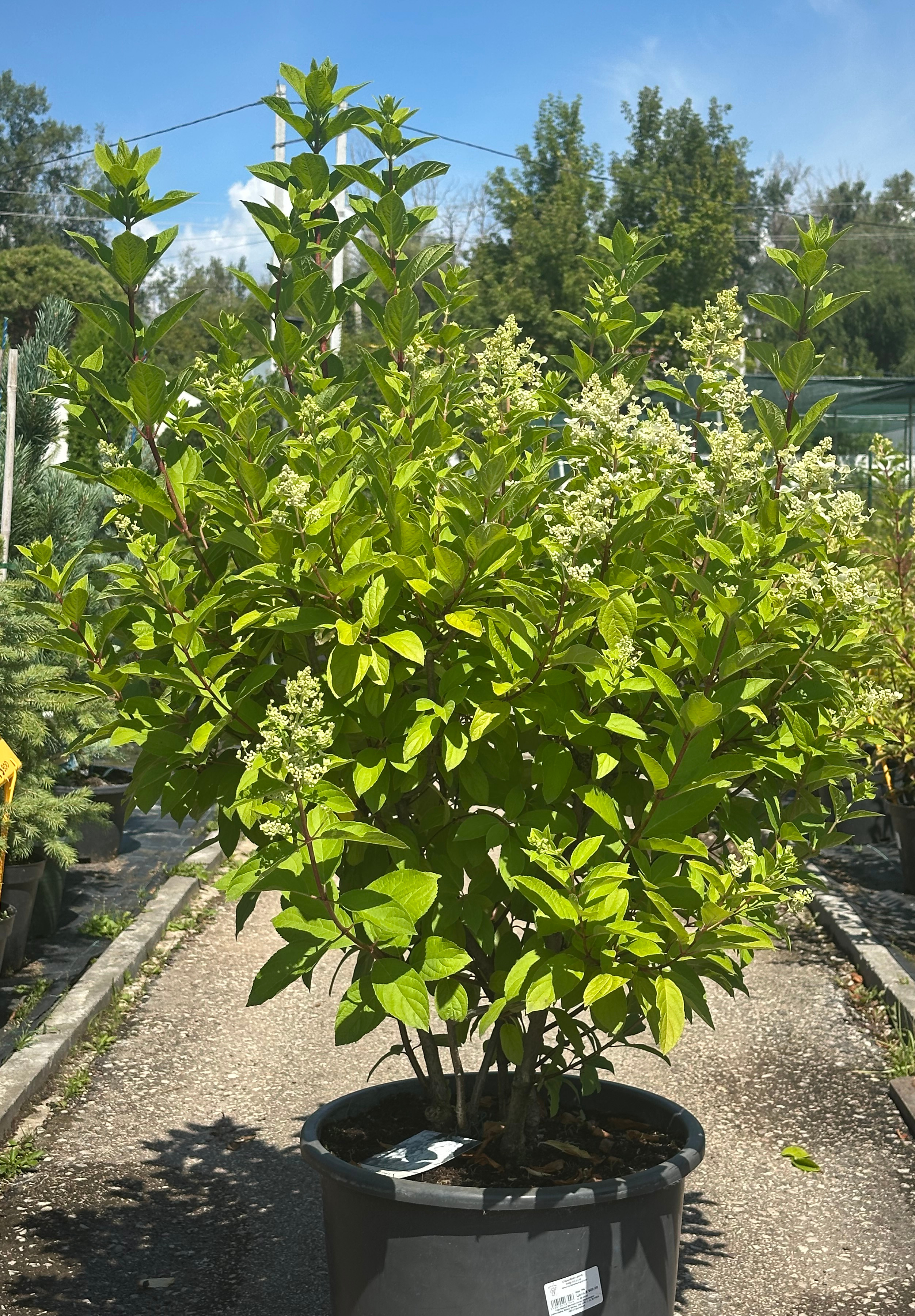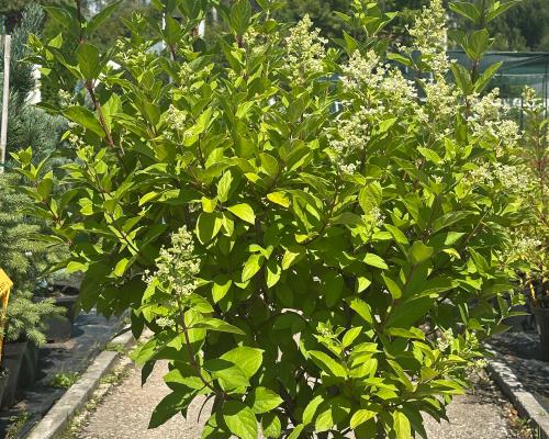Гортензия метельчатая «Пинки Винки» (Pinky Winky) имеет округлую форму и ярко-зелёные листья, на фоне которых хорошо выделяются красные ветви. В середине лета распускаются крупные белые соцветия, которые к осени приобретают нежно-розовый оттенок у основания. Цветки постепенно меняют окраску от кремовых к розовым тонам, создавая привлекательный декоративный эффект. При этом цветочные конусы продолжают расти, образуя на концах новые белые цветки.