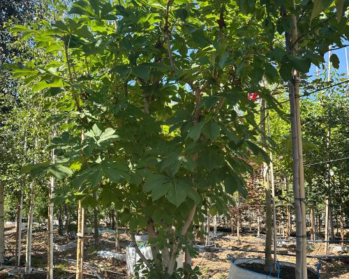 Это дерево привлекает внимание своей мощной и густой кроной, крупными пальчатыми листьями, свечеобразными соцветиями и шаровидными зелёными колючими плодами.