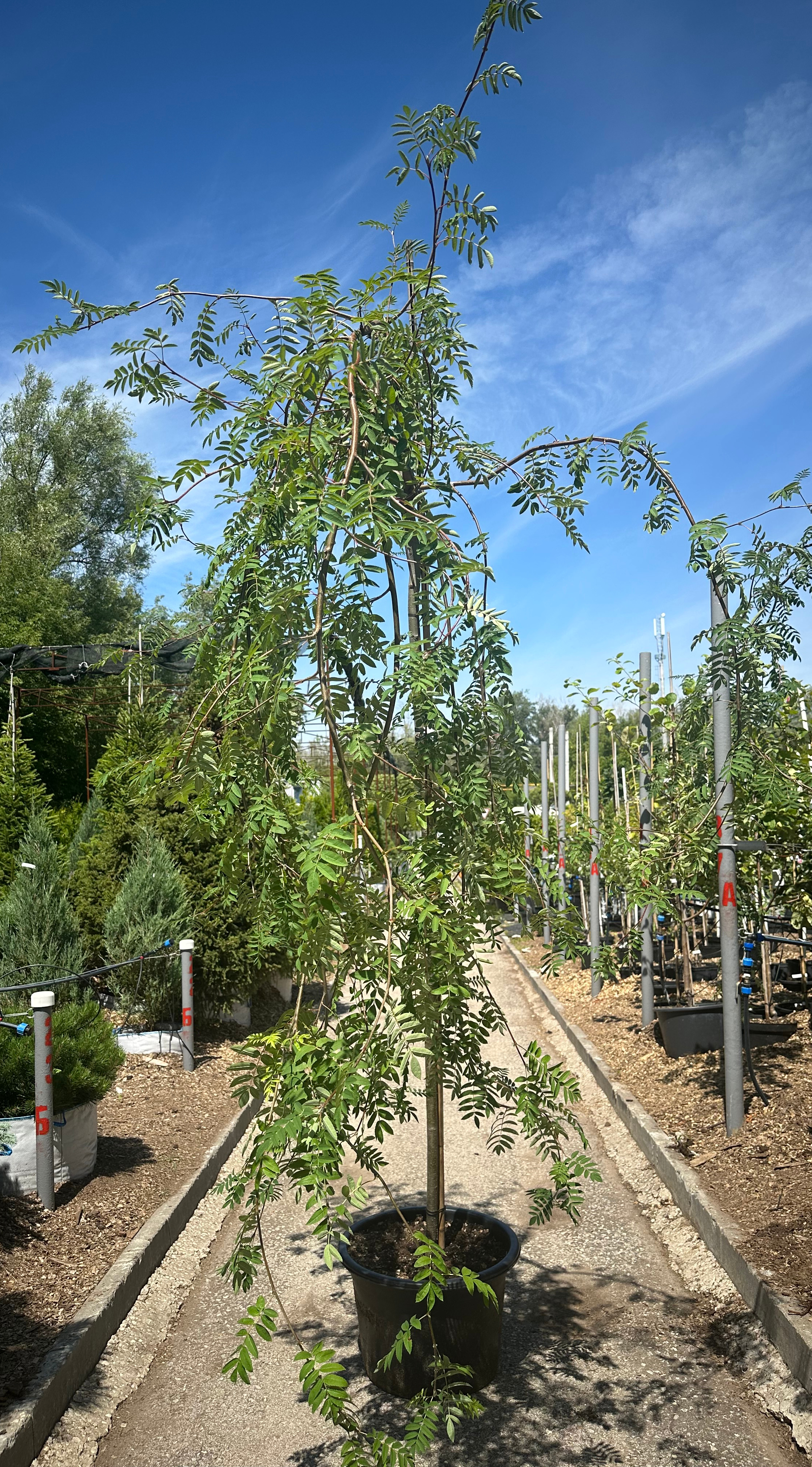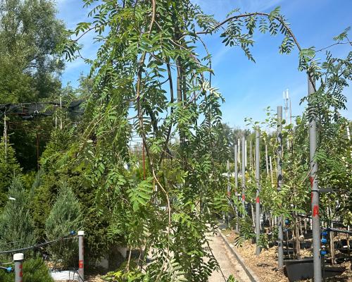 Штамбовое дерево с раскидистой плакучей кроной. Высота дерева зависит от высоты прививки, обычно достигает 6–8 метров, а диаметр — до 5 метров. Ветви длинные, поникающие, часто с красивыми изгибами. Листья сложные, непарноперистые, тёмно-зелёные, осенью приобретают оранжево-красный оттенок. Цветки белые, собраны в крупные щитковидные соцветия, обладают приятным ароматом. Цветёт в конце мая — начале июня. Плоды оранжево-красные, шаровидные, долго сохраняются на ветвях. Темп роста средний.