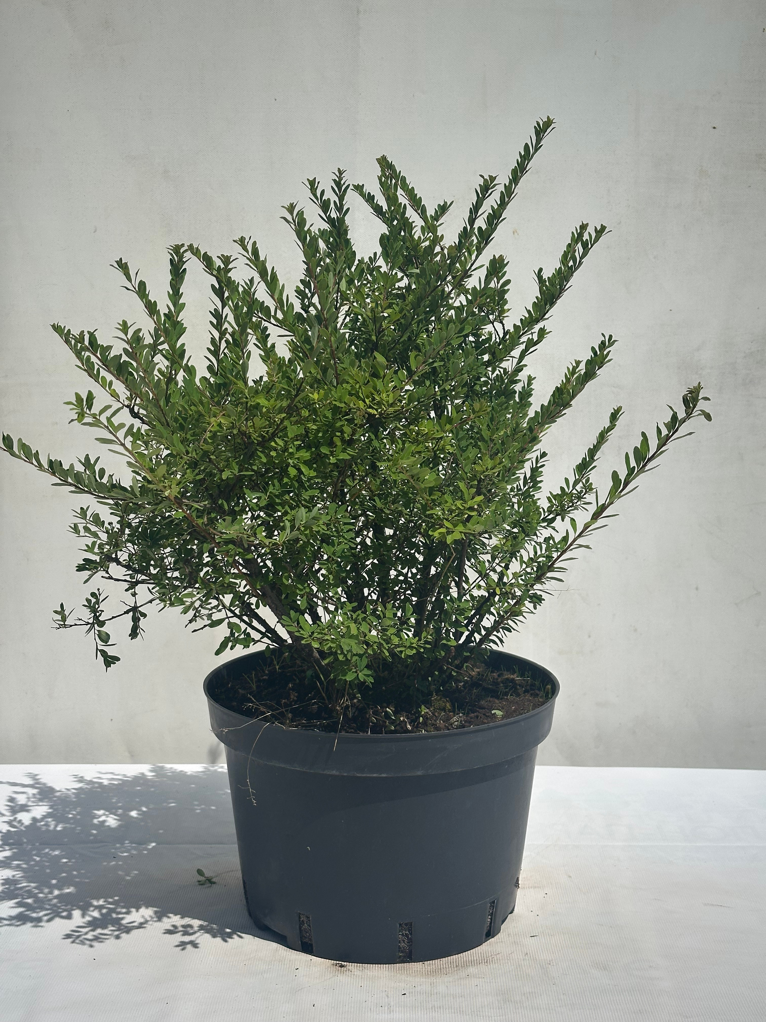 Кустарник с раскидистой кроной, достигающий в высоту 1,5 метра и 2 метра в ширину. Крона очень густая, ветви изящно изогнуты. Листья тёмно-зелёного цвета. Цветки белые, собраны в небольшие щитковидные соцветия, которые полностью покрывают побеги.